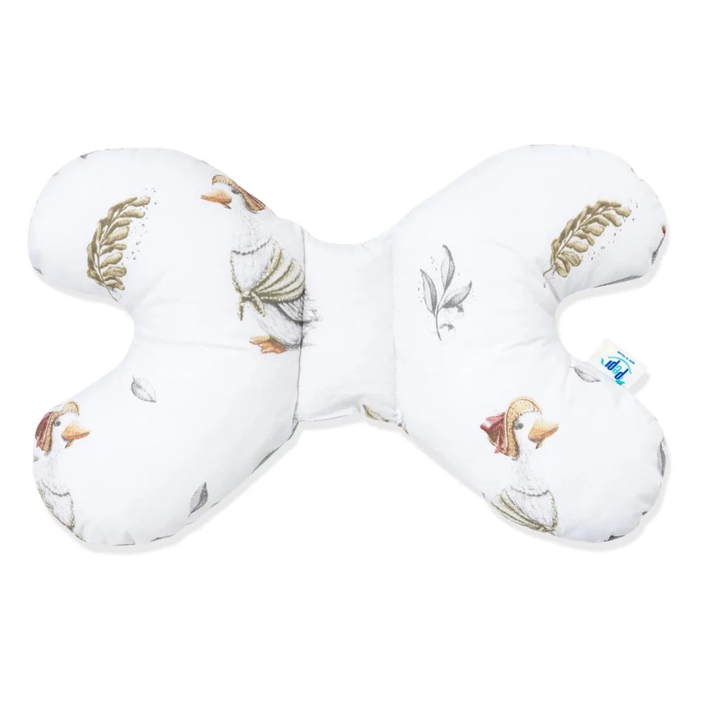 A pillangó párna speciálisan kifejlesztett formája támogatja a gyermek fejének természetes helyzetét, megakadályozva annak ellenőrizetlen elmozdulását és az esetleges mikrosérüléseket.