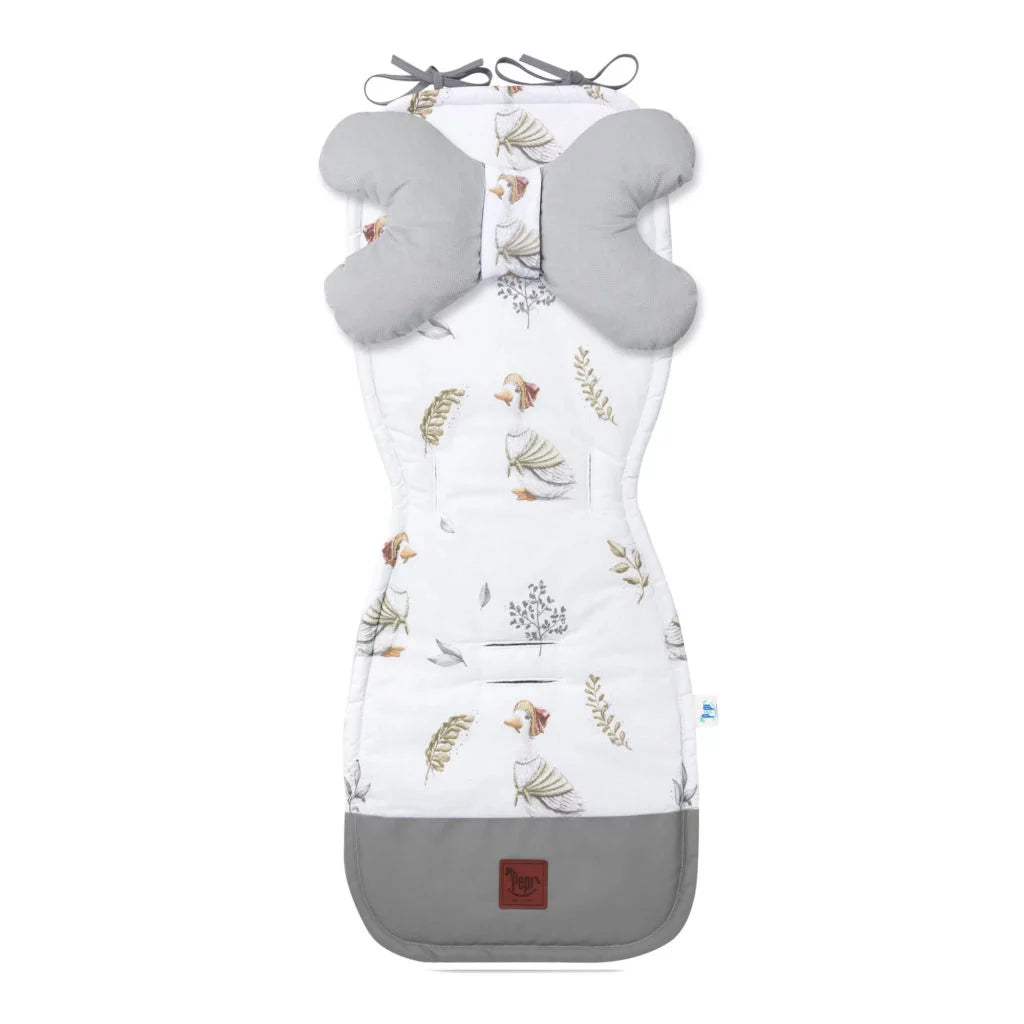 A szett egy kétoldalas babakocsi betétből, PILLANGÓ párnából, tépőzáras fejpántból és két övvédőből áll.
