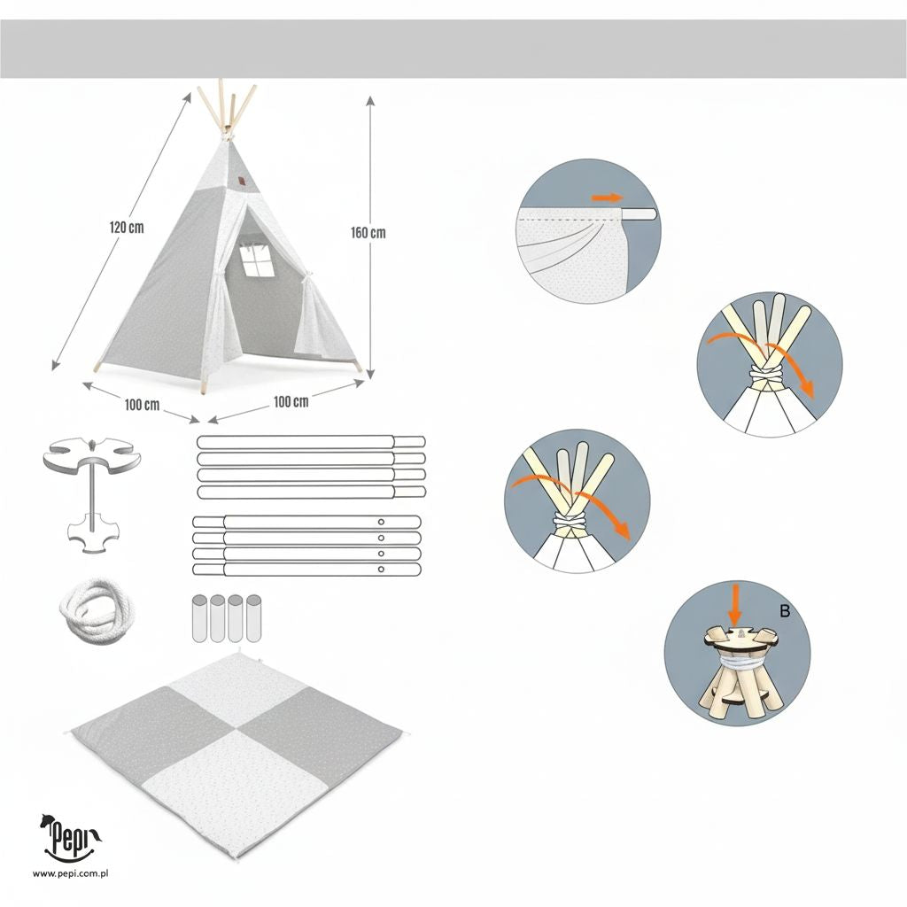 A sátor kézzel, természetes pamutból készült, lányok és fiúk számára egyaránt. Ablaka van, amit függönnyel lehet eltakarni. A bejáratot szalaggal felköthető függöny díszíti, amelyet le lehet engedni. A készlet tartalmazza a sátrat és egy puha pamut szőnyeget. AJÁNDÉK stabilizátor a rudak kereszteződésénél történő összeszereléshez.