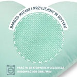 A díszpárna kézzel, a legnagyobb precizitással készült, és biztonságos, antiallergén szilikon golyóval van töltve, amely megfelelő légáramlást és rugalmasságot biztosít. A biztonság érdekében nincs cipzárja. Teljes egészében mosható.