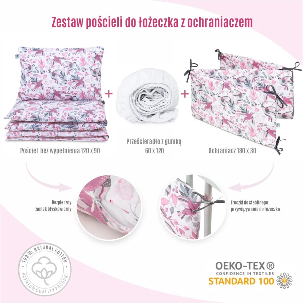 Ágyneműhuzat 4az1-ben - garnitúra kiságyba (90x120) lepedővel és rácsvédővel - Hummingbird grey