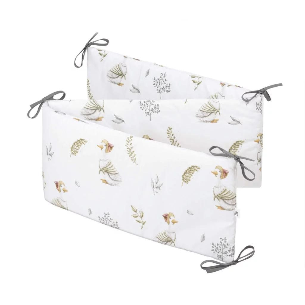A tökéletesen illeszkedő, bevarrt gumival ellátott lepedő (60x120 cm-es matracra) garancia arra, hogy simán a matracon marad egész éjjel, még egy nagyon mozgékony kicsi mellett is. Ez nemcsak esztétikus megjelenést, hanem mindenekelőtt biztonságot és alvási kényelmet biztosít. A puha rácsvédő védi a gyermek finom fejét a kiságy rácsaihoz való véletlen ütközéstől, és egy hangulatos, biztonságos légkört teremt körülötte.