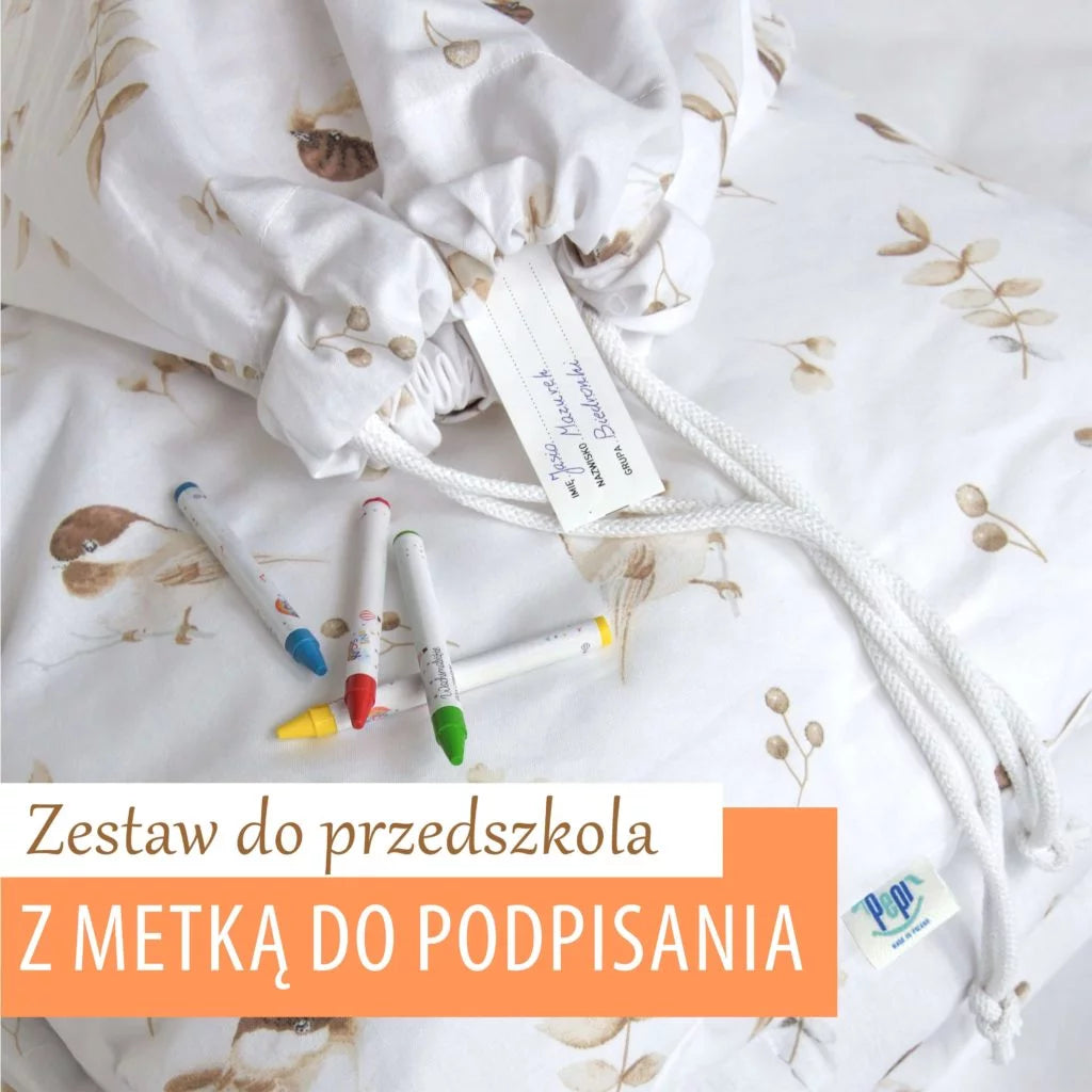 Tudjuk, mennyire fontos a szervezettség az óvodai valóságban. Ezért a szetthez egy praktikus, pamut zsák is tartozik, amely megkönnyíti az ágynemű mindennapi szállítását és higiénikus tárolását az intézményben. Nincs több aggodalom az elveszett vagy összekevert dolgok miatt! A szettben egy speciális címkét is találsz, amelyre tartósan ráírhatod a gyermek nevét, vezetéknevét és a csoport nevét - ez felbecsülhetetlen segítség a személyzetnek és garancia arra, hogy az ágynemű mindig visszakerül a tulajdonosához.
