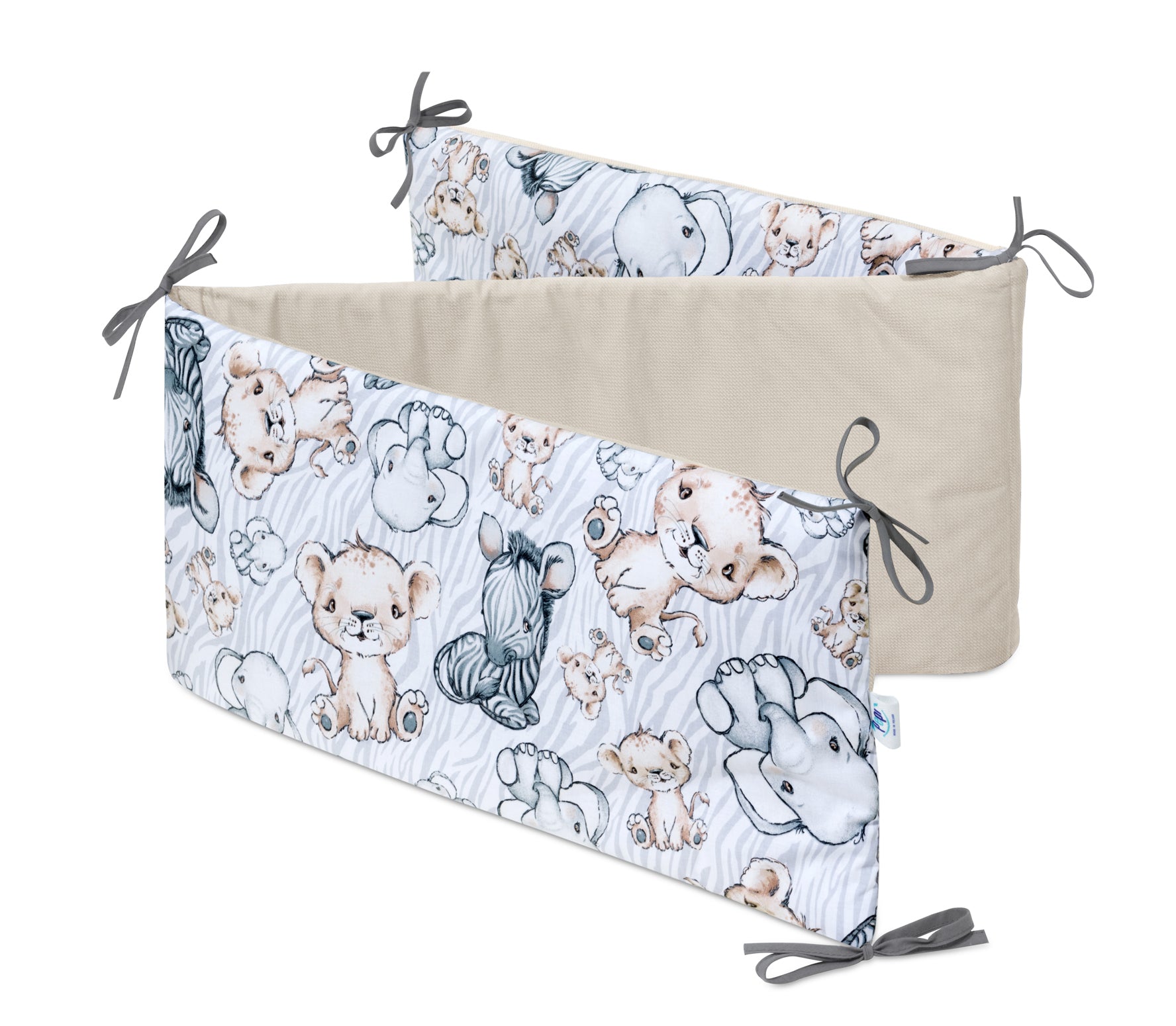 Biztosítsd kisbabádnak a legbiztonságosabb és legkuckósabb alvóhelyet! Ez a kézzel varrott rácsvédő (180x30 cm) tanúsított anyagokból garantálja a nyugodt alvást és védelmet nyújt a kiságy kemény részeivel való véletlen ütközések ellen, valamint megakadályozza, hogy a kezek vagy lábak becsússzanak a rácsok közé alvás vagy aktív játék közben. Három stabil részből áll, hosszú megkötőkkel, ami biztosítja a tökéletes illeszkedést és a könnyű felszerelést.
