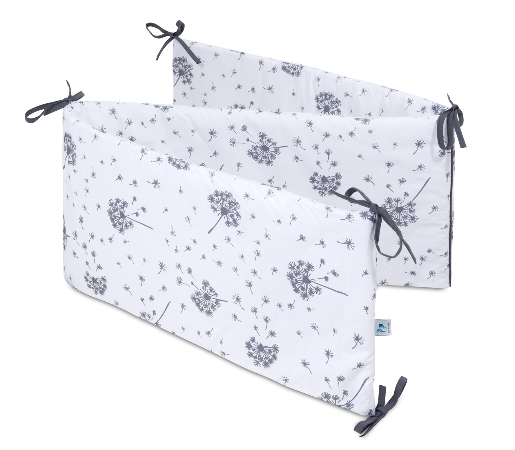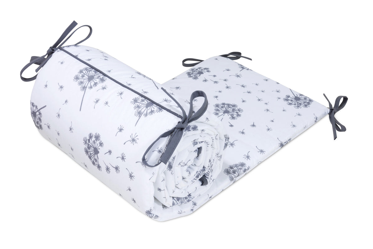 Biztosítsd kisbabádnak a legbiztonságosabb és legkuckósabb alvóhelyet! Ez a kézzel varrott rácsvédő (180x30 cm) tanúsított anyagokból garantálja a nyugodt alvást és védelmet nyújt a kiságy kemény részeivel való véletlen ütközések ellen, valamint megakadályozza, hogy a kezek vagy lábak becsússzanak a rácsok közé alvás vagy aktív játék közben. Három stabil részből áll, hosszú megkötőkkel, ami biztosítja a tökéletes illeszkedést és a könnyű felszerelést.