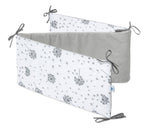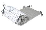 Biztosítsd kisbabádnak a legbiztonságosabb és legkuckósabb alvóhelyet! Ez a kézzel varrott rácsvédő (180x30 cm) tanúsított anyagokból garantálja a nyugodt alvást és védelmet nyújt a kiságy kemény részeivel való véletlen ütközések ellen, valamint megakadályozza, hogy a kezek vagy lábak becsússzanak a rácsok közé alvás vagy aktív játék közben. Három stabil részből áll, hosszú megkötőkkel, ami biztosítja a tökéletes illeszkedést és a könnyű felszerelést.