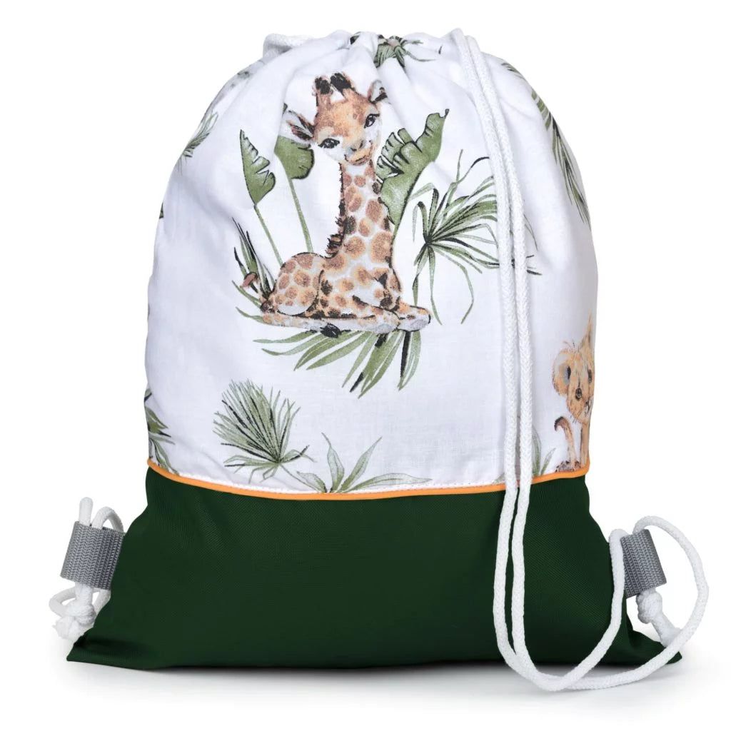 A zsák felső része légáteresztő pamutból készült, ami megfelelő légáramlást biztosít és védi a tartalmat a nedvességtől. A zsák alja tartós, vízálló anyagból van varrva, ami védelmet garantál a szennyeződések és a nedvesség ellen. A zsák pamut zsinórral húzható össze, amely állítható, így a gyermek kényelmesen hordhatja a hátán.