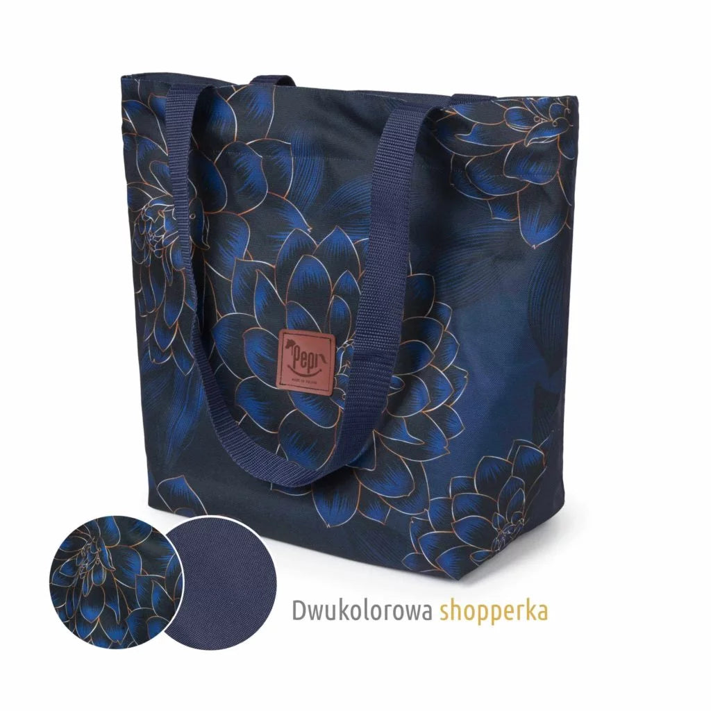 A vállra akasztható shopper táska, mérete 44x34x8 cm (+-1 cm), vízálló anyagból készült. A patentos záródás biztosítja a tartalom biztonságát, míg a belső cipzáras zseb megkönnyíti a kisebb tárgyak rendszerezését.